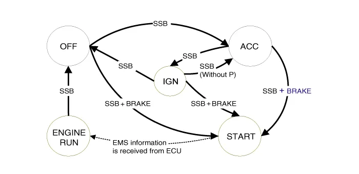 Referring to the terminals, the system states described in the table above are same as those one found in a system based on a mechanical ignition switch. The one of distinction with Mechanical-Ignition-Switch based system is that the BES system allows specific transition from [OFF] to [START] without going through [ACC] and [IGN] states.
