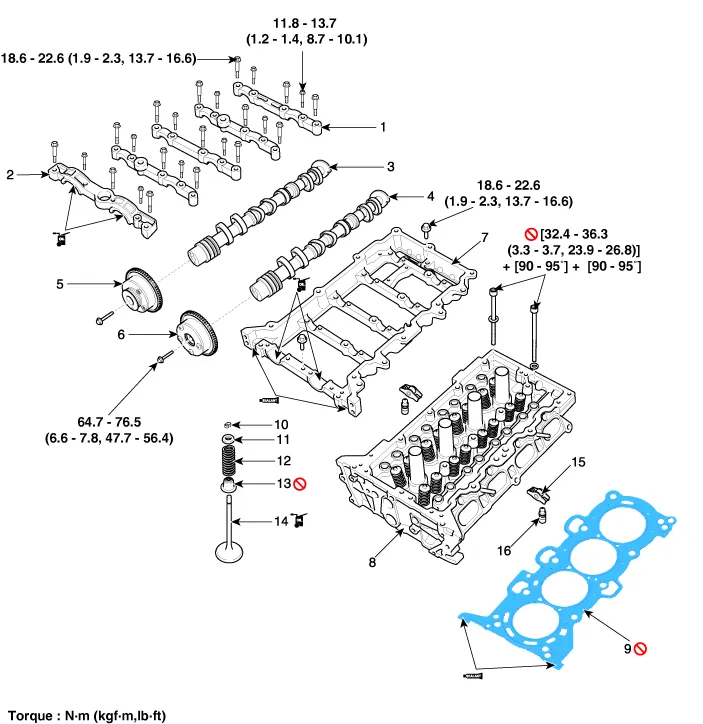 1. Camshaft bearing cap 2. Camshaft front bearing cap 3. Exhaust camshaft 4. Intake camshaft 5. Exhaust CVVT assembly 6. Intake CVVT assembly |