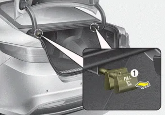 4. Pull out the seatback locking knob(1) in the trunk, then fold the seat toward the front of the vehicle.