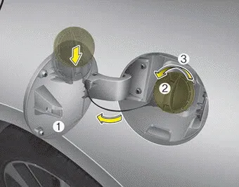 4. To remove the cap, turn the fuel filler cap (2) counterclockwise(3).