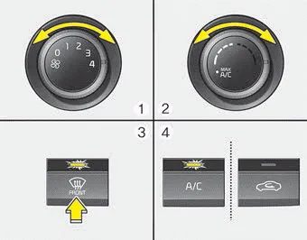To defog inside windshield 1. Set the fan speed to the desired position. 2. Select desired temperature. 3. Press the defroster button ( ). 4. The outside (fresh) air position will be selected automatically and the air conditioning will turn on according to the detected ambient temperature.