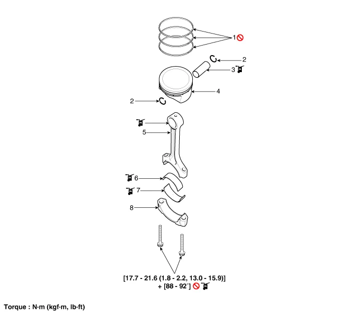 5. Connecting rod 6. Connecting rod upper bearing 7. Connecting rod lower bearing 8. Connecting rod bearing cap |