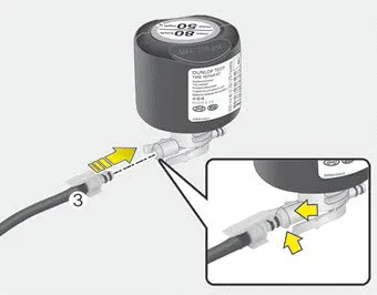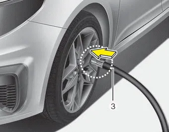 1.After driving approximately 7 ~ 10 km (4 ~ 6 miles) or about 10 minutes, stop at a suitable location. 2.Connect the filling hose (3) of the compressor (clip mounted side) directly and then connect the filling hose (3) (opposite side) to the tire valve.