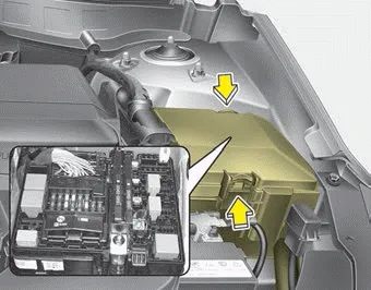 Always securely install the fuse panel cover in the engine compartment to protect against electrical failure which may occur from water contact. Listen for the audible clicking sound to ensure fuse panel cover is securely fastened.