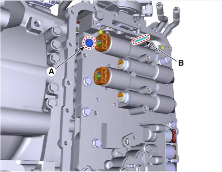 Remove the solenoid valve fixing pin (B) and loosen the valve body mounting bolt (A).