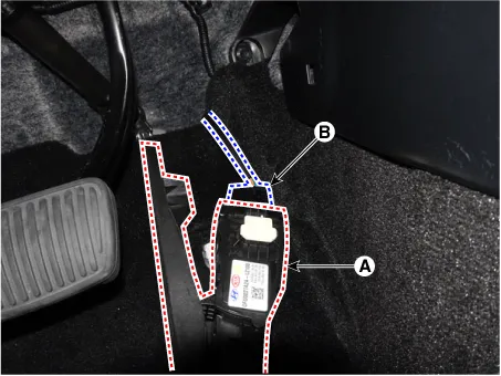 Remove the connector (A) from the accelerator pedal module (B).