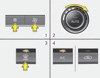 To defog inside windshield 1. Set the fan speed to the desired position. 2. Select desired temperature. 3. Select the or position. 4. The outside (fresh) air and air conditioning will be selected automatically.