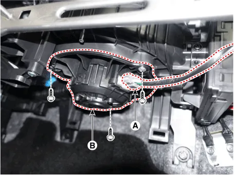 Separate the connector (A), loosen the mounting screws and remove the blower motor (B).