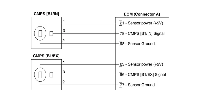 The two CMPS are installed on engine head cover of bank 1 and 2 (intake, exhaust) respectively and use a target wheel installed on the camshaft. |