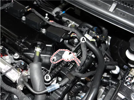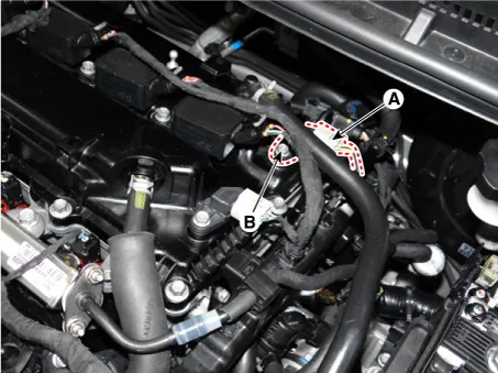 Remove the camshaft position sensor after loosening the mounting bolt (B).