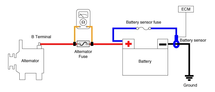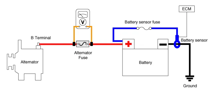 Voltage Drop Test of Alternator Output Wire This test determines whether or not the wiring between the alternator "B" terminal and the battery (+) terminal is good by the voltage drop method.