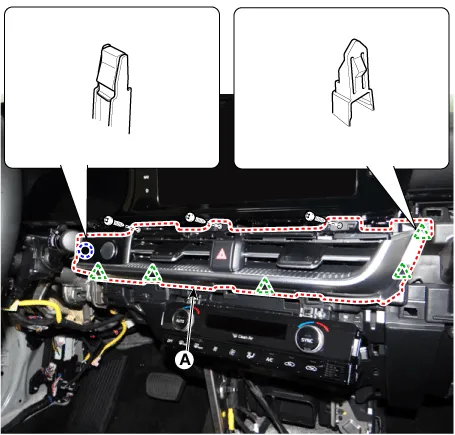 After loosening the mounting bolt and nuts, screws, remove the crash pad center panel (A).