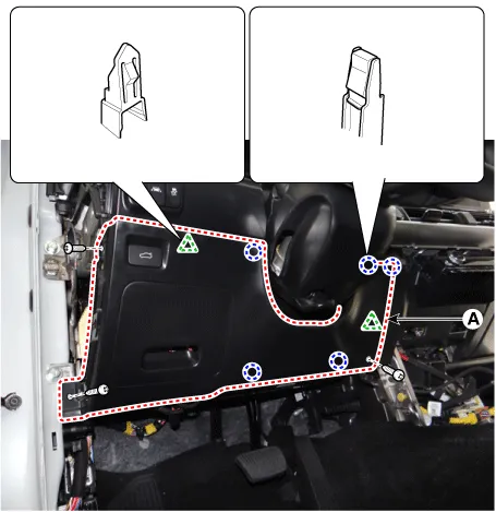 Loosen the mounting screws and remove the crash pad lower panel (A).