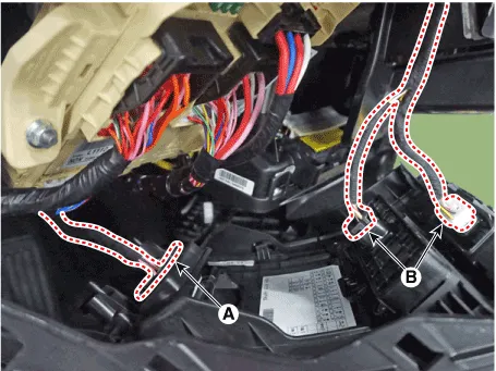 Press the lock pin and separate the diagnosis connector (A) and trunk swich connectors (B).