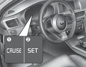 1. Press the CRUISE button on the steering wheel to turn the system on. The CRUISE indicator light in the instrument cluster will illuminate. 2. Accelerate to the desired speed, which must be more than 30 km/h (20 mph).