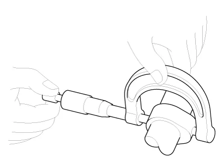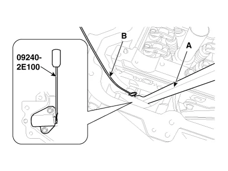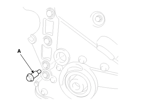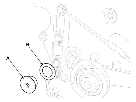 Compress the piston of the tensioner using a handy bar (A) and then insert a stopper pin (B) into the hole on the tensioner to hold the compressed piston.