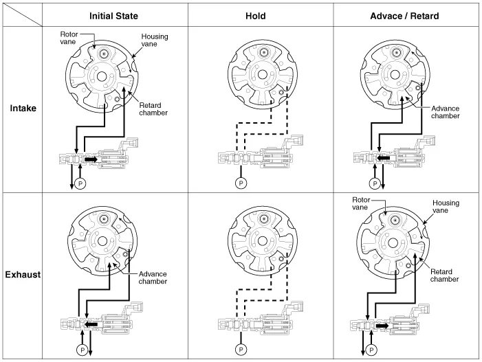 The CVVT has the mechanism rotating the rotor vane with hydraulic force generated by the engine oil supplied to the advance or retard chamber in accordance with the CVVT oil control valve control.