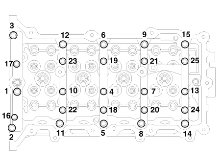 | 1. Camshaft bearing cap 2. Camshaft front bearing cap 3. Exhaust camshaft |
