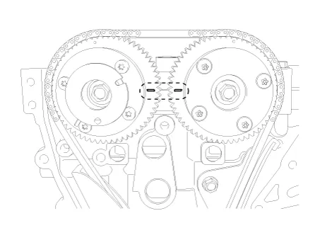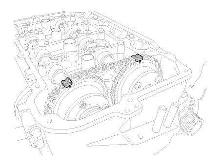 Turn the crankshaft two turns in the operating direction (clockwise), and then check that the TDC marks of the CVVT sprockets are in straight line on the cylinder head surface.