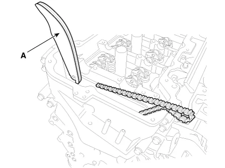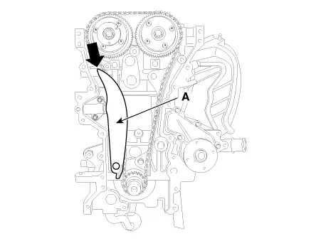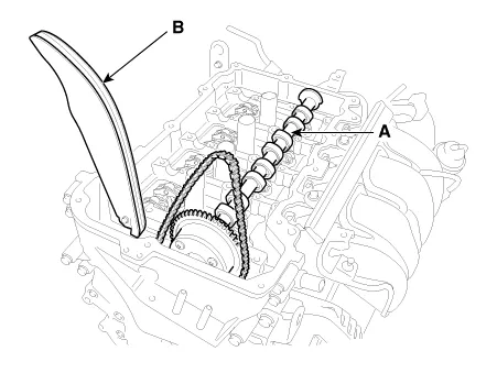 Place the intake camshaft (A) and then insert the tensioner arm (B) along the timing chain.