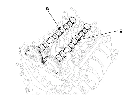 Remove the exhaust camshaft (A) first, then intake camshaft (B).
