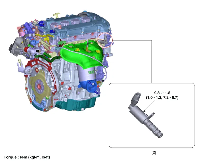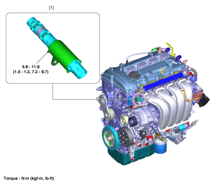 the CVVT Oil Control Valve (OCV) which supplies the engine oil to the cam phaser or cuts the engine oil from the cam phaser in accordance with the PWM (Pulse With Modulation) control signal of ECM. |