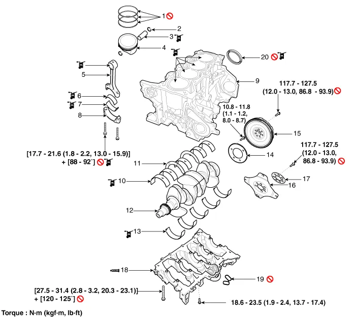 8. Connecting rod bearing cap 9. Cylinder block 10. Crankshaft upper bearing 11. Crankshaft thrust bearing 12. Crankshaft 13. Crankshaft lower bearing 14. Crankshaft position sensor (CKPS) wheel |