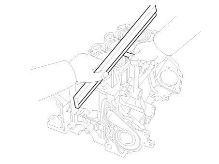 Inspect top surface of cylinder block for flatness. Using a precision straight edge and feeler gauge, measure the surface contacting the cylinder head gasket for warpage.