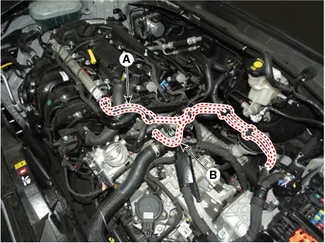 Disconnect the fuel hose (A) and purge control solenoid valve (PCSV) hose (B).