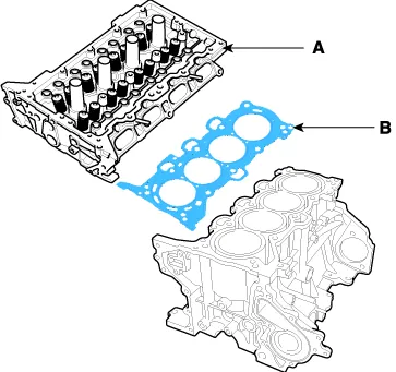 Place the cylinder head (A) carefully to protect damage to the head gasket (B) during installation.