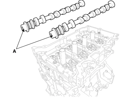 Components and components location Components 1. Camshaft bearing cap 2. Camshaft front bearing cap 3. Exhaust camshaft 4.