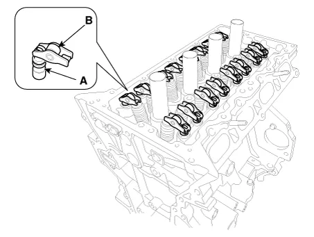 Remove the hydraulic lash adjuster (HLA) (A) and the swing arm (B).