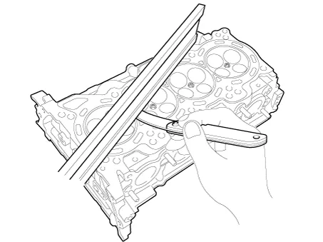 Using a precision straight edge and feeler gauge, measure the contacting surface of the cylinder block and the manifolds for warpage. If the flatness is greater than maximum, replace the cylinder head.