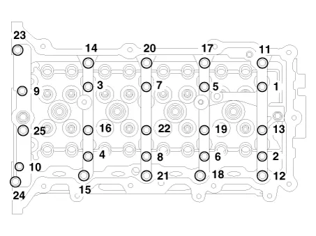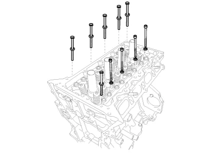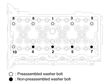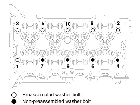 Install the cylinder head bolts with washers. Using SST (09221-4A000), install and tighten the 10 cylinder head bolts, in several passes, in the sequence as shown.
