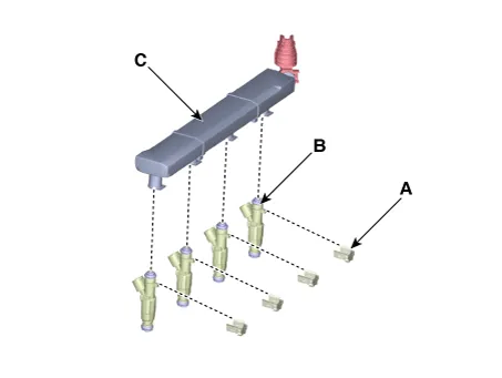 Separate the injector (B) from the delivery pipe (A) after removing the clip (C).