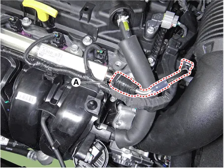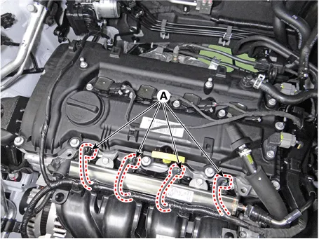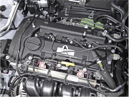 Remove the delivery pipe & injector assembly (B) after loosening the mounting bolts (A).