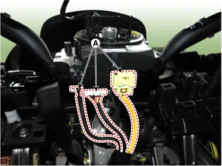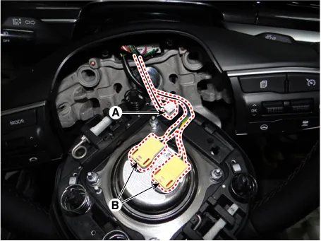 Disconnect the horn connector (A) and driver airbag module connector (B).