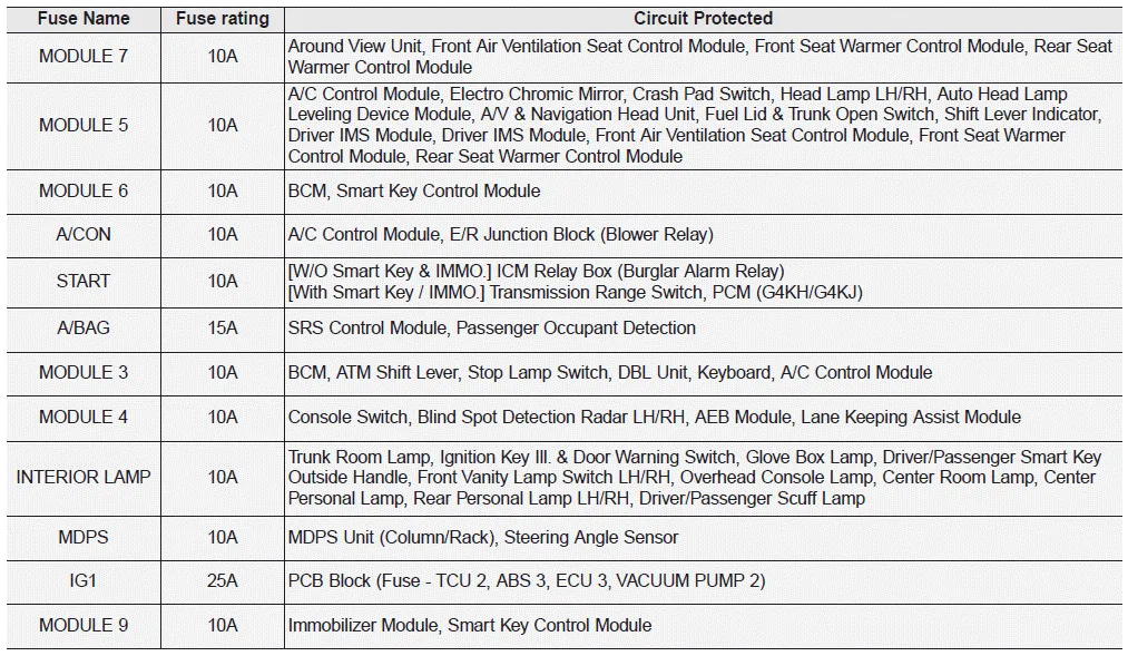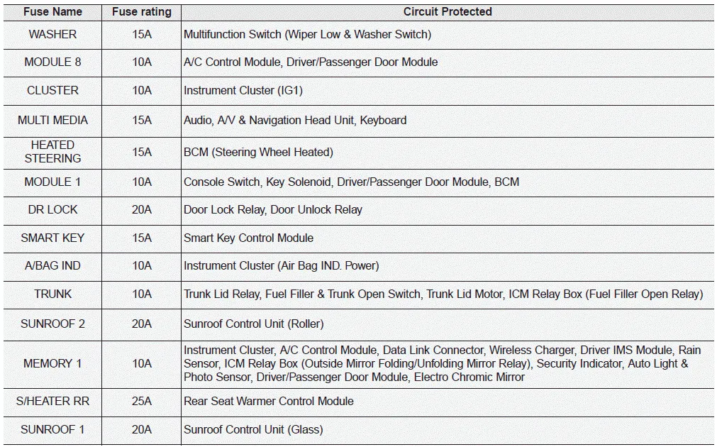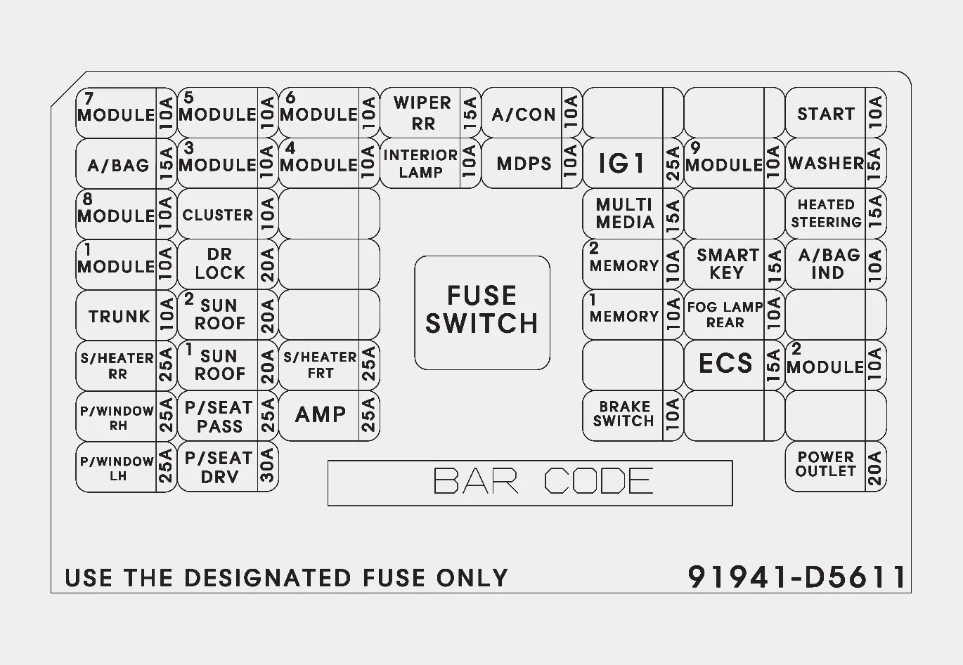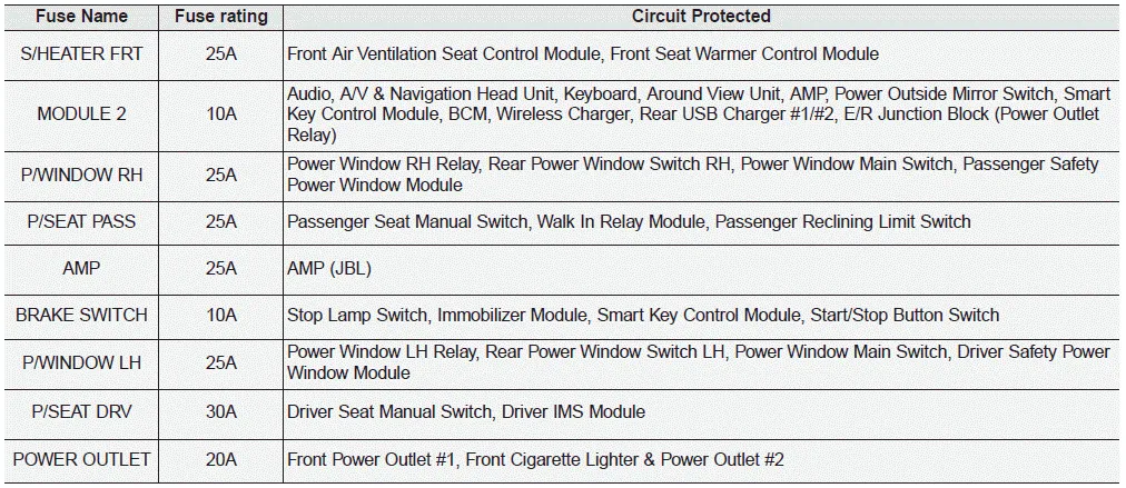 Inside the fuse/relay panel covers, you can find the fuse/relay label describing fuse/relay name and capacity.