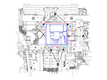Remove the E-call unit (A) after loosening the mounting nuts (B).
