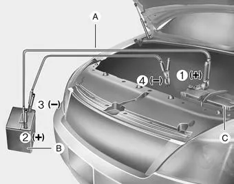 5. Start the engine of the vehicle with the booster battery and let it run at 2,000 rpm, then start the engine of the vehicle with the discharged battery.