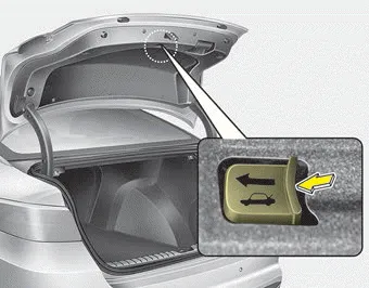 Your vehicle is equipped with an emergency trunk release lever located inside the trunk. If someone is inadvertently locked in the trunk, moving the handle in the direction of the arrow will release the trunk latch mechanism and open the trunk.
