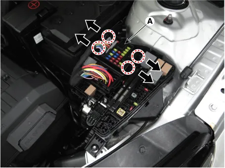 Push the hooks in the direction of the arrow and lift up the engine room PCB block (A).