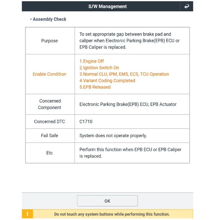 After replacing the ESC control module execute the "Assembly Check (ECU replacement)" of the additional function to check that the mounting is successful. |