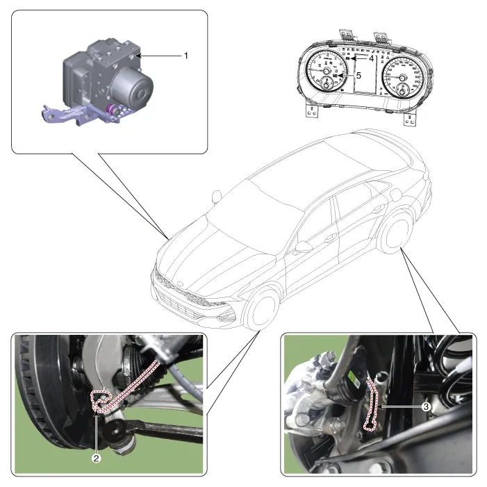 2. Front wheel speed sensor 3. Rear wheel speed sensor |