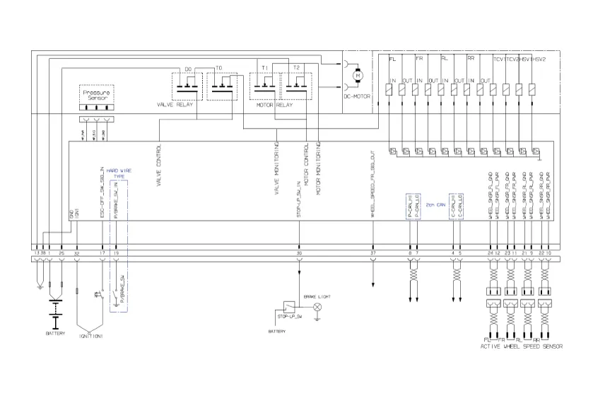 TCS function prevents the wheel slip of drive direction by adding the brake pressure and engine torque reduction via CAN communication. TCS function uses the wheel speed sensor signal to determine the wheel slip as far as ABS function.
