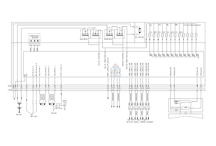 ABS/EBD function : The ECU changes the active sensor signal (current shift) coming from the four wheel sensors into square waves. By using the input of above signals, the ECU calculates the vehicle speed and the acceleration & deceleration of the four wheels. And, the ECU judges whether the ABS/EBD should be actuated or not.