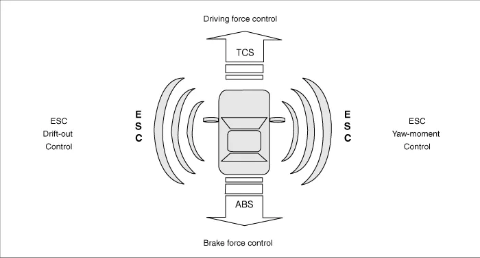 ESC adds an additional function known as Active Yaw Control (AYC) to the ABS, TCS, EBD and ESC functions. On contrary, the ABS/TCS function controls wheel slip during braking and accelerating, and thus, mainly intervenes in the longitudinal dynamics of the vehicle, and the active yaw control stabilizes the vehicle on the vertical axis.