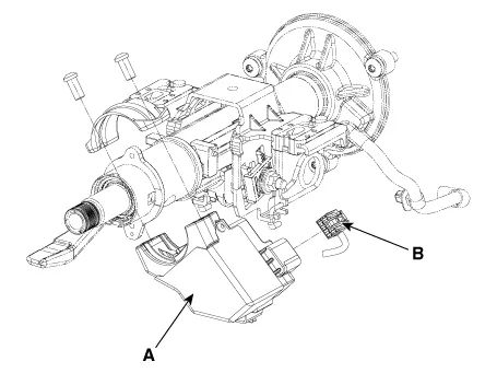 Remove the electronic steering column lock (A) by loosening the mounting bolts after disconnecting the connector (B).