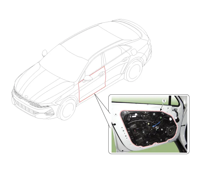 Components and components location Component Location 1. Front door window glass Repair procedures Replacement • When removing with a flat-tip screwdriver or remover, wrap protective tape around the tools to prevent damage to components.