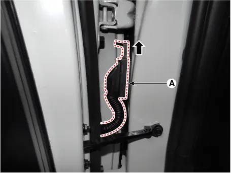 Release the locking pin in the direction of the arrow and remove the front door main wiring connector (A).